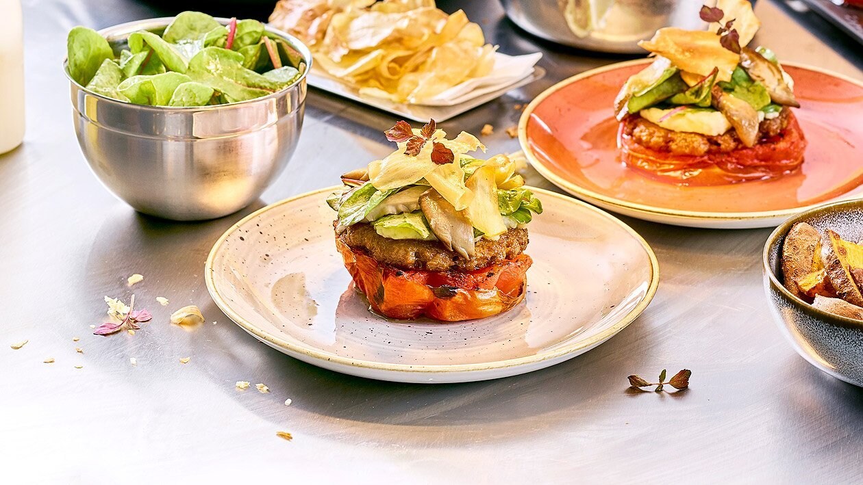 Tomaten Burger mit Pastinakencreme und Austernpilzen