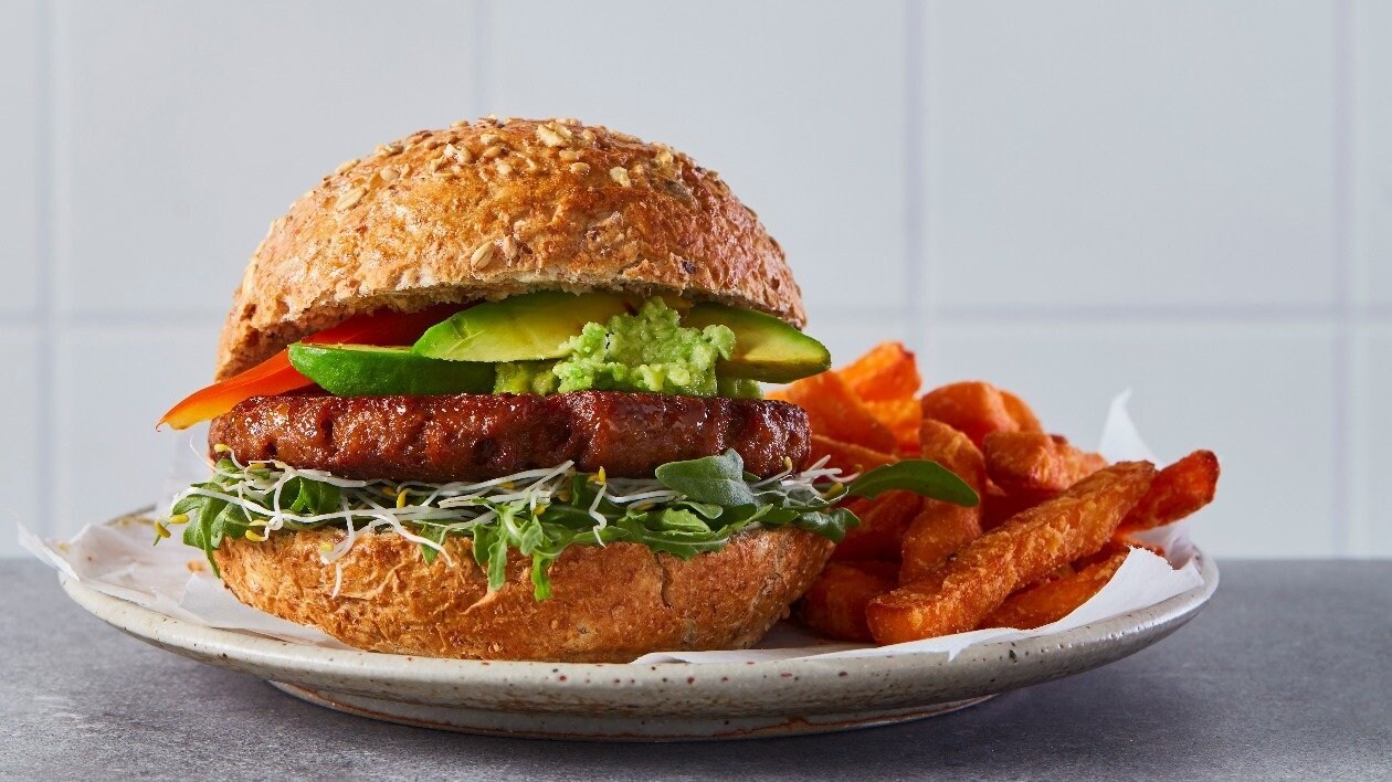Vegetarischer NoBeef Burger mit Avocado und rotem Paprika