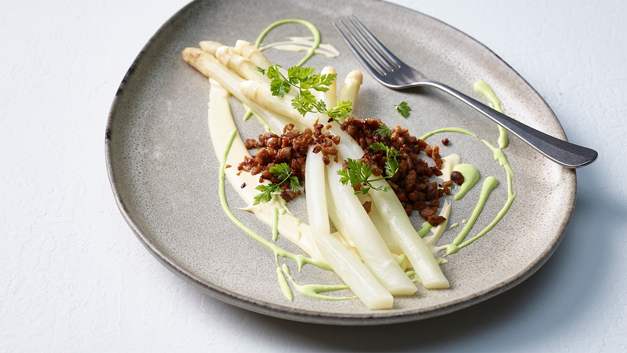 Weißer Spargel mit veganem Faschierten und veganer Bärlauch-Hollandaise