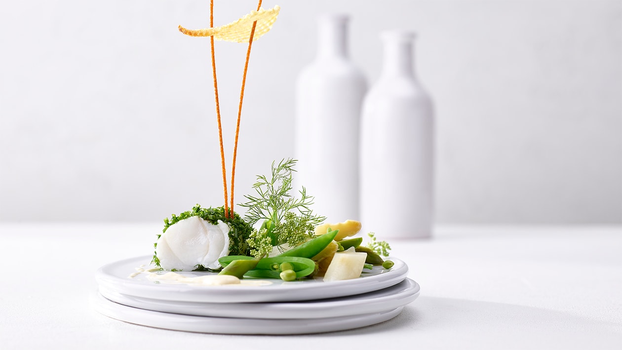 Weißer Spargel, Seeteufel, Frühlingsgemüse, Vanille-Emulsion