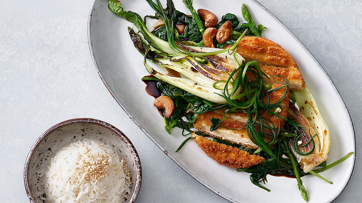 Wokpfanne mit Spinat, Crispy-Streifen und Basmatireis
