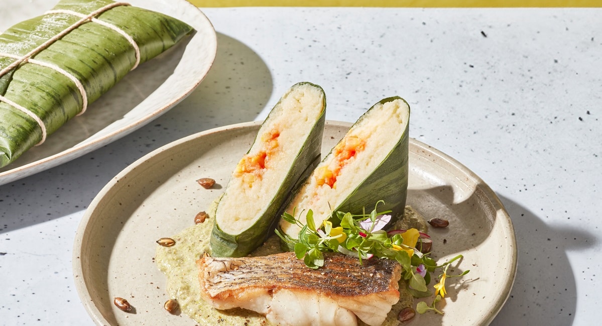 Wolfsbarsch in grüner Mole mit Erdäpfeln und grüner Tamale