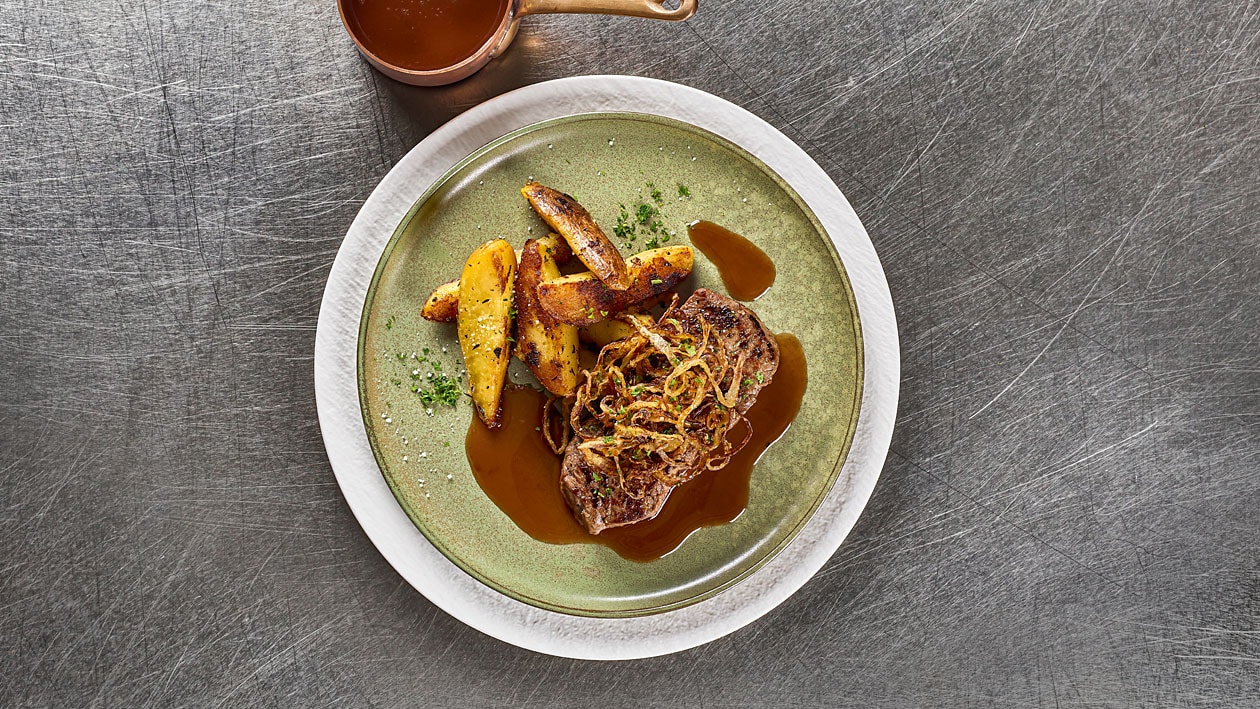 Zwiebelrostbraten mit Rotweinsauce und Röstkartoffeln