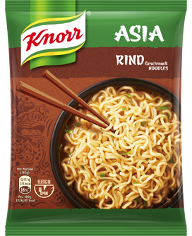 KNORR Asia Noodles mit Rind Geschmack: schneller Nudelsnack für zwischendurch. Einfach mit heißem Wasser aufgießen, 4 Minuten warten und genießen.