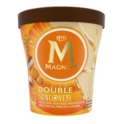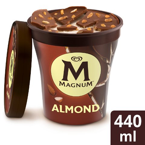 Der Magnum Klassiker auch auch zum Löffeln. Feine Vanilleeiscreme mit Milchschokoladenstücken, Mandelstiften in einer knackigen Milchschokoladenhülle.
