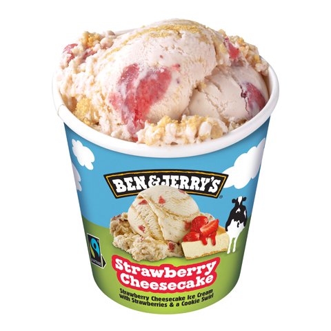 Erdbeer- Käsekuchen-Eiscreme mit Erdbeerstücken und einem Keksstrudel