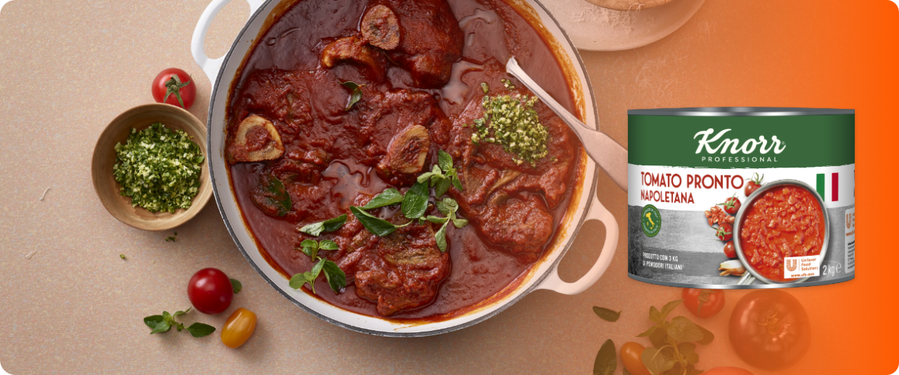 Mit der Knorr Professional Tomato Pronto Napoletana kommen aromatische, italienische Tomaten auf die Teller: Die stückigen Tomaten eignen sich nicht nur als Basissauce für deine Pasta-Gerichte, sondern treffen auch als Tomatensoße für Reis den Geschmack deiner Gäste.